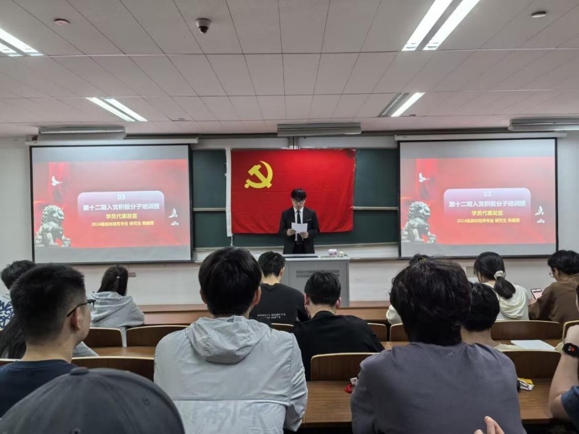 2024级森林培育专业研究生陈振霄作为学员代表进行发言。他向全体入党积极分子发出三点倡议:一、珍惜学习机会,提升思想境界;二、严格要求自己,锤炼过硬本领;三、牢记党的宗旨,勇担时代使命。