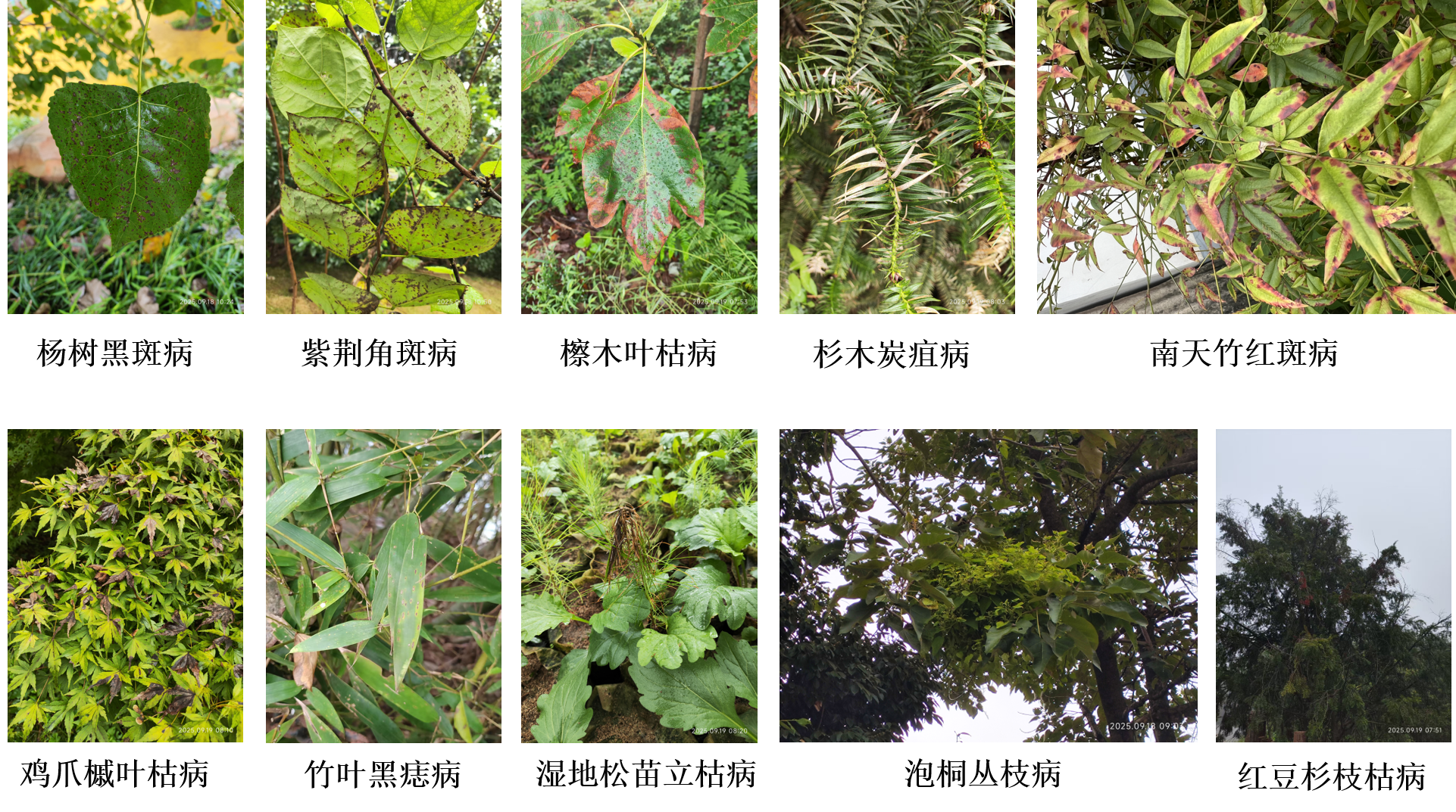 实习期间,师生们分阶段、分区域对泾县马头林场、水西国家森林公园、月亮湾及桃花潭景区等地,开展了系统而深入的植物病害多样性调查。在教师全程指导下,同学们分别对多个典型林区的阔叶树(如杨树、檫木、板栗、樟树等)、针叶树(如马尾松、湿地松、杉木等)以及常见园林绿化树种(如桂花、鸡爪槭等)进行了持续四天的病害调查与标本采集,识别出包括松苗立枯病、杨树黑斑病、紫荆角斑病、朴树煤污病、樟树枝枯病、泡桐丛枝病、杉木炭疽病、红豆杉枝枯病及松材线虫病等多种病害类型。