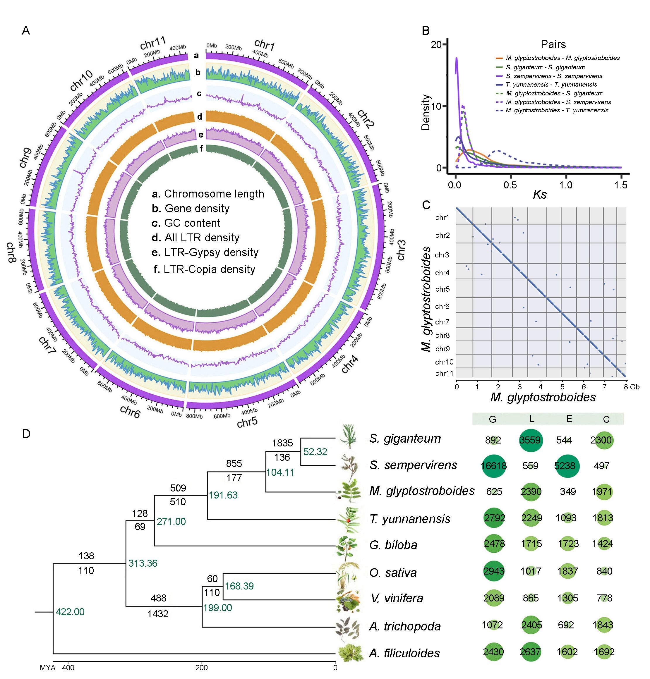 研究应用三代测序和Hi-C技术对水杉基因组进行测序组装,得到8.07 Gb染色体级别的高质量基因组。分析表明进化过程中,水杉丢失和收缩的基因家族远多于获得和扩张的基因家族。转录组比较发现,水杉和几种被子植物在水淹胁迫响应中的基因表达调控上具有较高的保守性。研究揭示了红杉亚科三个单种属树种遗传和形态的多样性可能是由不完全普系分选(ILS),即从祖先种群中随机保留了不同的等位基因,而非种间杂交造成。同时明确了红杉亚科中的多倍体北美红杉为同源六倍体,且多倍化后染色体的剧烈重排可能是造成裸子植物多倍体现象较少的原因。