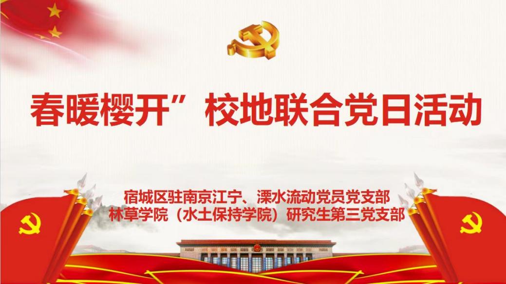 为深入学习贯彻党的二十大精神,深化校地党建合作,凝聚党员先锋力量,2025年3月30日上午,研究生第三党支部与宿城区驻南京流动党员党支部在林学楼1118会议室联合举办"红色纽带连初心,薪火共筑启新程"主题党日活动。活动由驻江宁溧水片区流动党员党组织负责单位、驻江宁溧水片区流动党员、研究生第三党支部共同参与。
