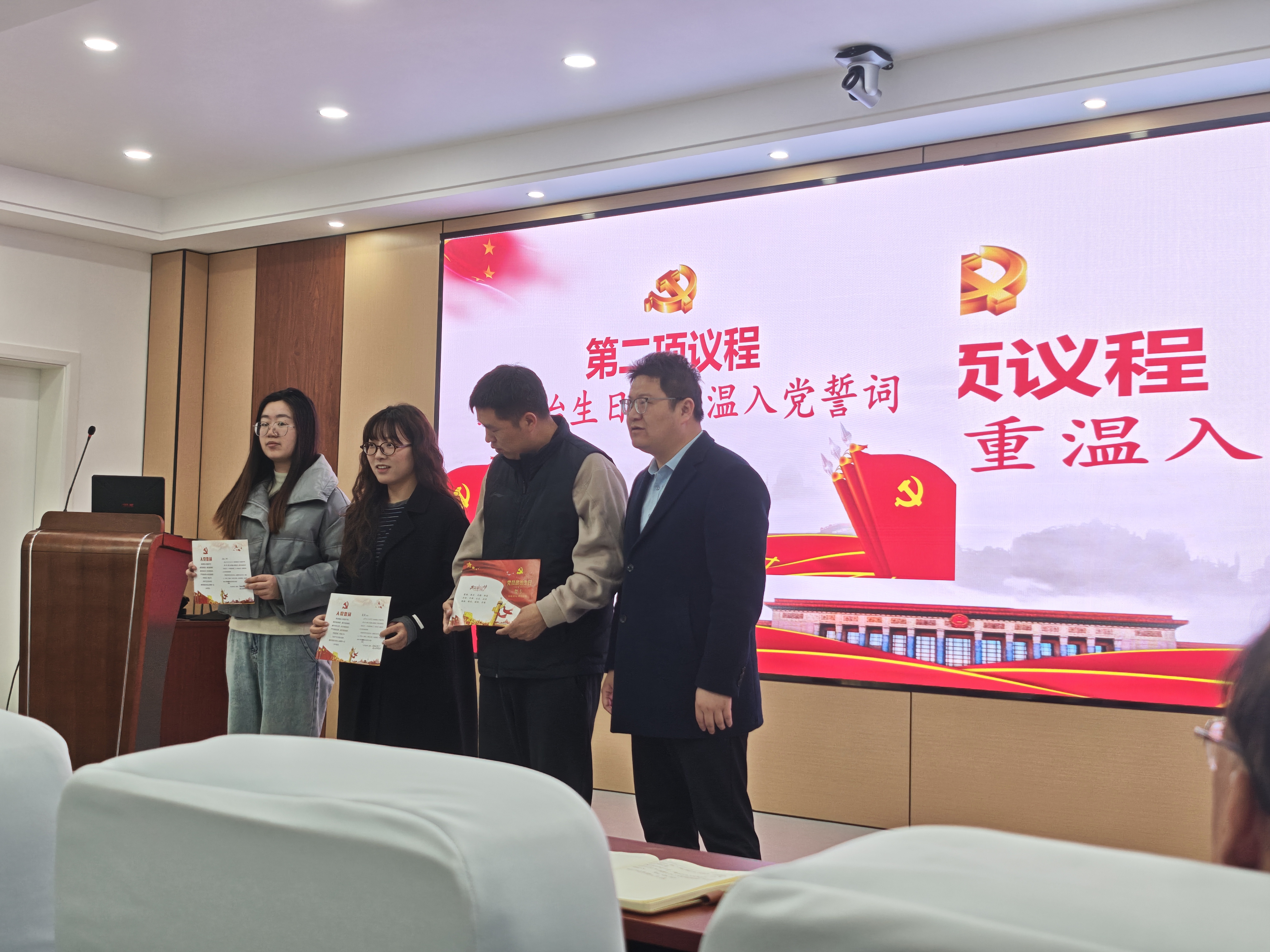 共过"政治生日",重温入党誓词环节,全体党员面向党旗庄严宣誓。扬镇党委委员、组织委员、工会主席兼校友党员丁裕祥同志作为领誓人,带领大家回顾入党初心。"誓词不仅是承诺,更是行动指南。"他在发言中鼓励青年党员要将个人理想融入国家发展大局,在实践中锤炼党性修养。铿锵有力的宣誓声响彻会场,将活动推向高潮。随后,全体人员合影留念,共同记录这一红色时刻。