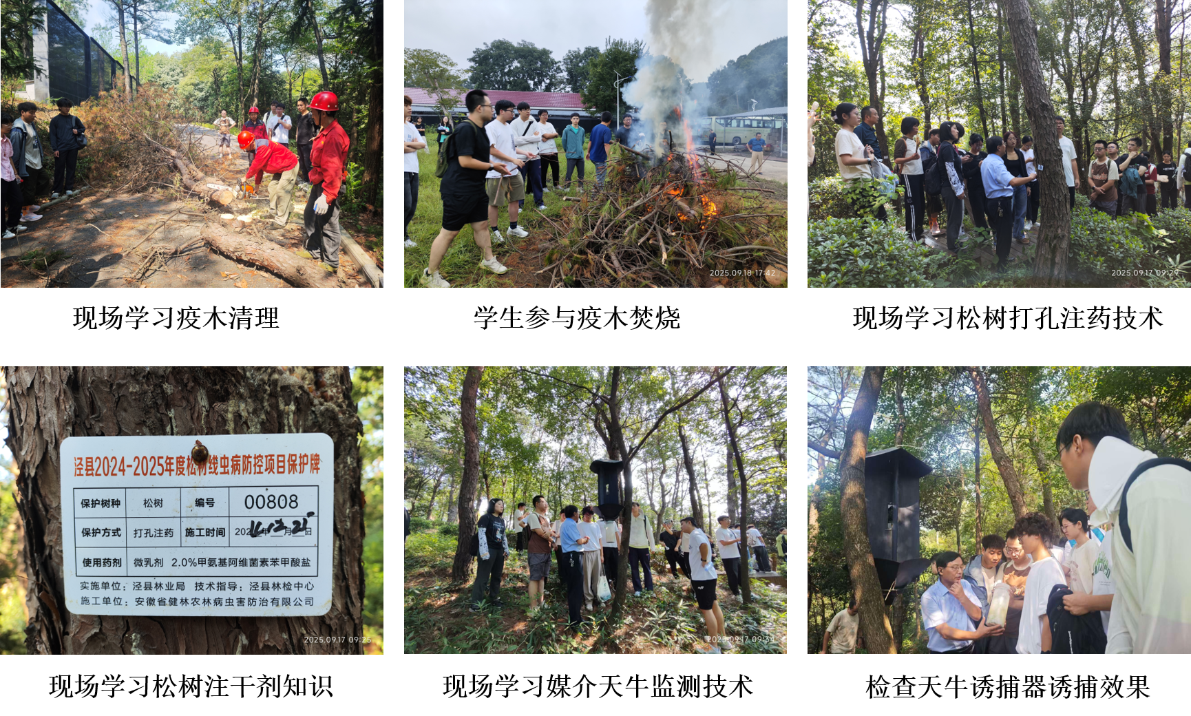 同学们还深入松材线虫病除治现场,观摩并学习疫木除治、树干注射、媒介天牛诱捕及无人机监测与飞防等一线防治技术,全面了解当前我国松材线虫病的综合治理策略与新装备应用进展。这一环节有效打通了从理论认知到现场实操的关键路径,显著提升了学生们解决实际问题的专业素养。