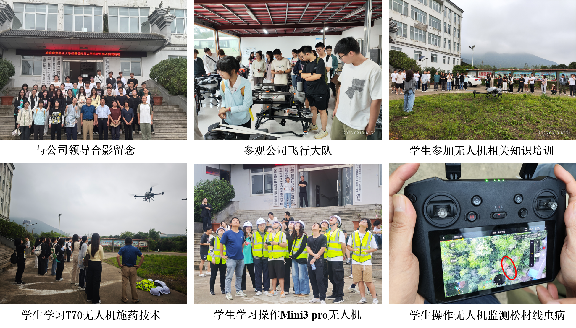 实习团队特别参访了安徽健林农林病虫害防治有限公司——南京林业大学研究生培养基地及安徽省一级防治资质的专业机构。公司飞行大队现场演示了大疆T70等植保无人机的飞防作业,并指导学生亲手操作大疆Mini3 Pro无人机,体验其在病害监测、药剂喷施等方面的应用优势。