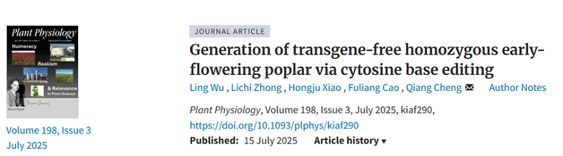 近日,我校中国工程院院士曹福亮教授团队程强课题组在《Plant Physiology》发表题为《Generation of transgene-free homozygous early-flowering poplar via cytosine base editing》的研究论文,成功创制出无转基因插入、表型稳定的早花杨树纯合突变体,为林木基因编辑育种提供了关键技术支撑。