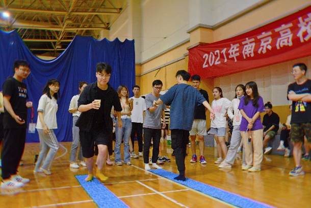 开场表演后,迎来了第一个比赛项目:“指压板接力赛”,这是一个需要忍耐和平衡结合的游戏。每个参赛队伍出4名参赛选手,两组同时比拼。参赛选手手持装满水的纸杯光脚踩在指压板上进行接力跑。现场气氛十分热烈,时不时会有参赛选手因为疼痛而走不稳,洒出水杯中的水,也许这就是所谓的痛苦并快乐着吧。