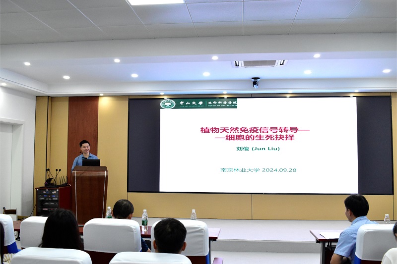 刘俊教授的报告题目是“植物天然免疫信号转导——细胞的生死抉择”。刘教授围绕植物土传病害中植物与微生物的互作机制研究,通过严谨的思路和详实的数据,揭示植物天然免疫应答的精细调控机理,包括植物细胞膜模式识别受体PRR的激活和抑制信号的精细调控机制。刘教授的研究为植物抗病育种和病害防治提供了重要的理论基础,激发了在场学生们对相关研究领域的浓厚兴趣与探索欲望。