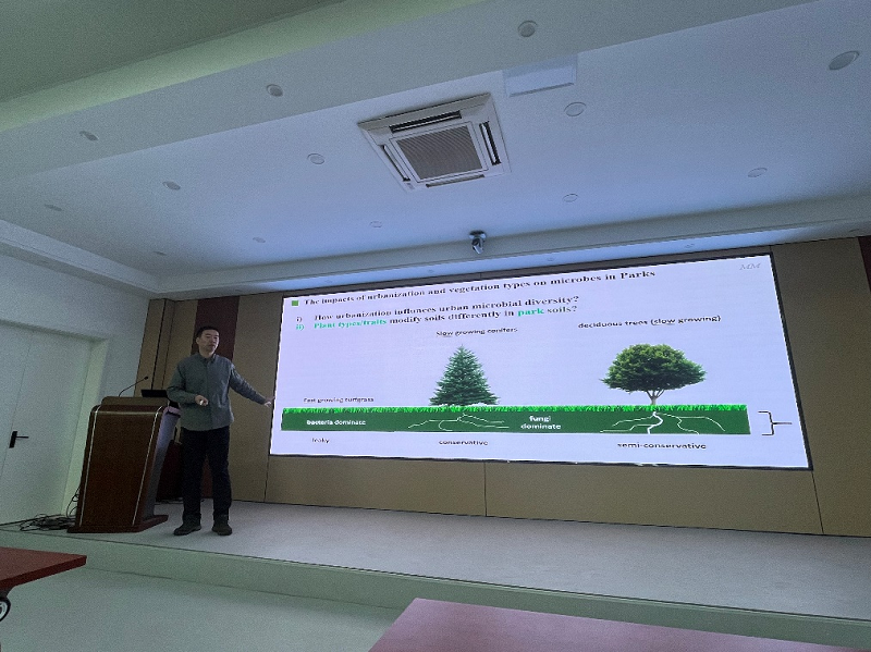 下半场讲座中,由惠楠研究员作了题为"Microbial biodiversity and their human-health related functions in cities"的专题报告。该报告从一个全新的角度讲述了微生物多样性和人类健康的关系,并证明可以通过调控环境微生物多样性来促进城市生态系统中的人类健康。实验收集了上海不同新旧居民区、农村地区、城市公园等众多数据,并筛选得到了与人类呼吸系统疾病相关的关键细菌和真菌物种。最终制作了气溶胶微生物采集装置,做到了在入室气溶胶中精准采集和鉴定出与人类呼吸系统疾病相关的微生物群落。该报告不仅为"健康城市"建设提供技术支撑,也为师生提供了在微生物多样性和公共卫生研究领域交叉融合的新范式。