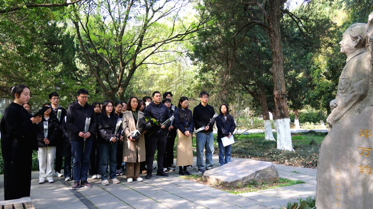 春日晨光中,郑万钧院士雕像巍然矗立。"碧水青山"传习社成员以饱含敬意的语调,回顾了郑万钧院士毕生献身林业科研、推动水杉发现与研究的卓越贡献。师生们垂首肃立,在郑万钧院士雕塑前进行了默哀。随后,手持鲜花,依次献于雕像前,一束束素菊,包含着后人对先辈的深深敬意与思念。