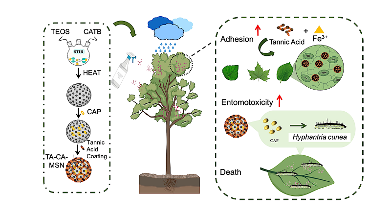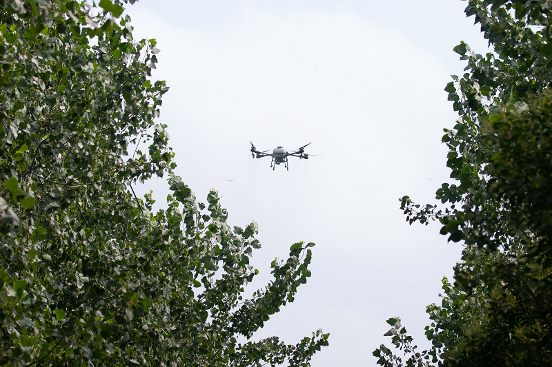 此外,针对项目研发的分子阻断和纳米农药技术,现场示范了运用植保无人机喷洒药剂防治美国白蛾幼虫。