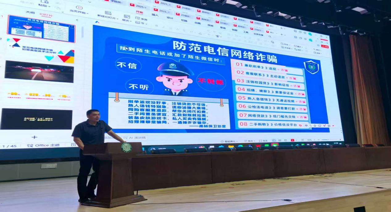 院党委副书记、副院长吴淳引导同学们主动融入大学生活,根据个人情况,探索大学要走的路。并针对近年来高校高发的电信网络诈骗案件,开展校园安全教育讲座,剖析了"刷单返利"、"冒充客服"、"虚假购物"等常见骗局,叮嘱同学们务必做到"不轻信、不透露、不转账",牢记"天上不会掉馅饼",为自己的财产安全筑起一道坚固的防火墙。