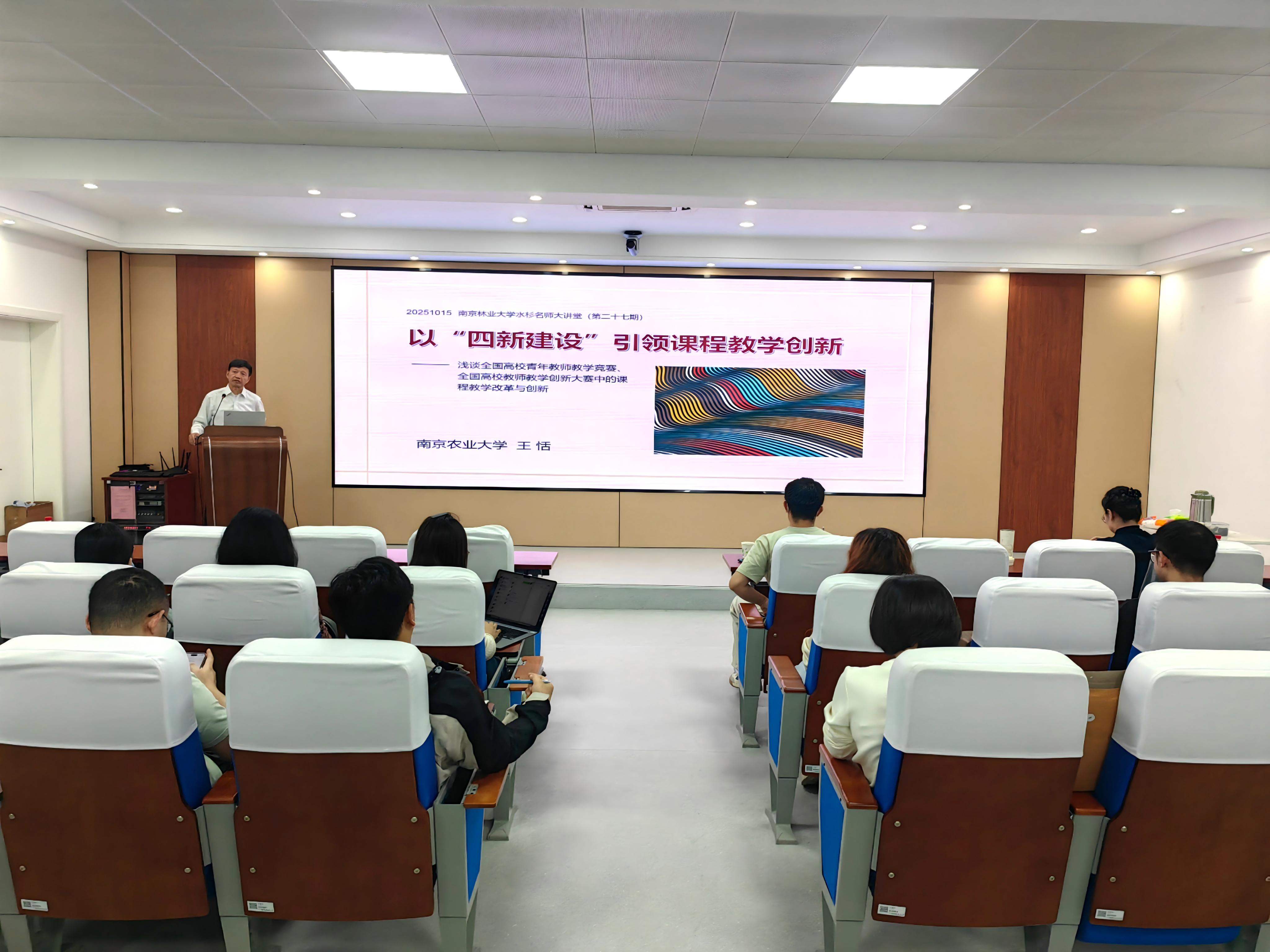 10月15日下午,皇冠新2官网入口 在林学楼1118报告厅成功举办“水杉”名师大讲堂。讲座特邀国家级教学名师、南京农业大学二级教授王恬主讲,主题为《以“四新建设”引领课程教学创新》,由姜姜院长主持,全校50余位青年教师积极参与学习和交流。